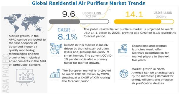 Residential Air Purifiers Market by Technology (High Efficiency Particulate Air (HEPA), Electrostatic Precipitators, Activated Carbon, Ultraviolet), Type (Portable Air Purifiers, In-duct Air Purifiers), COVID-19 Impact - Global Forecast to 2026", published by MarketsandMarkets™, the global Residential Air Purifiers Market is expected to reach USD 14.1 billion in 2026 from USD 9.6 billion in 2021, at a CAGR of 8.1% during the forecast period. The growth of this market is driven mainly by the growing popularity of smart homes, government regulatory support for effective air pollution monitoring and control, increasing public-private financing for effective air pollution monitoring, and increasing global air pollution levels and related public awareness. is led. there may be to increase. Effects of Air Pollution on Health Care and Environment.