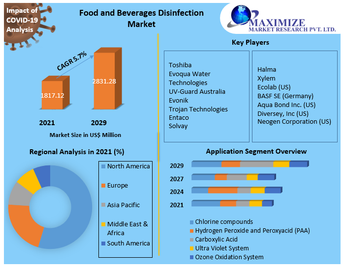 Food and Beverages Disinfection Market size was valued at US$ 1817.12 Mn. in 2021 and the total revenue is expected to grow at 5.7% through 2021 to 2029, reaching nearly US$ 2831.28 Mn in the forecast period.