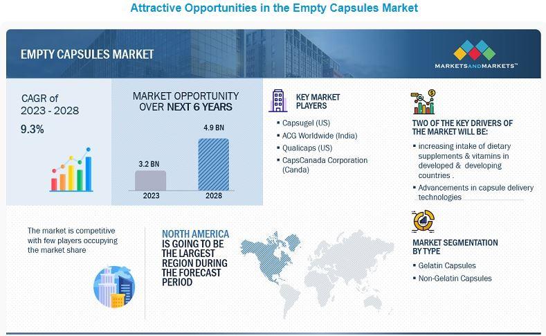 The report "Empty Capsules Market by Type (Gelatin, Non-gelatin), Functionality (Immediate-release, Sustained-release, Delayed Release), Therapeutic Application, End User (Pharmaceutical, Nutraceutical, Cosmetic, Reference Laboratories) - Global Forecast to 2028" ,size is projected to reach USD 4.9 billion by 2028 from 3.2 billion in 2023, at a CAGR of 9.3% during the forecast period. Factors such as rising R&D activities in empty capsules and increasing use of nutraceuticals are driving the growth of this market. However, dietary restrictions and cultural practices are the major factors restraining the growth of this market.