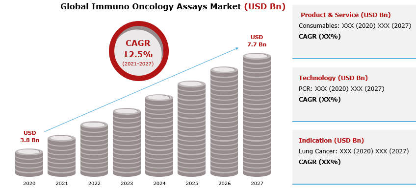 The objective of the study is to define Immuno Oncology Assays market sizes of different segments & countries in recent years and to forecast the values to the coming years. The report is designed to incorporate both qualitative and quantitative aspects of the industry within each of the regions and countries involved in the study. The Immuno Oncology Assays Market size was valued at US$ 3.8 Bn in 2020 and is expected to grow at a compound annual growth rate (CAGR) of 12.5% for the forecast period ending 2027 reaching a Market value of US$ 7.7 Bn.