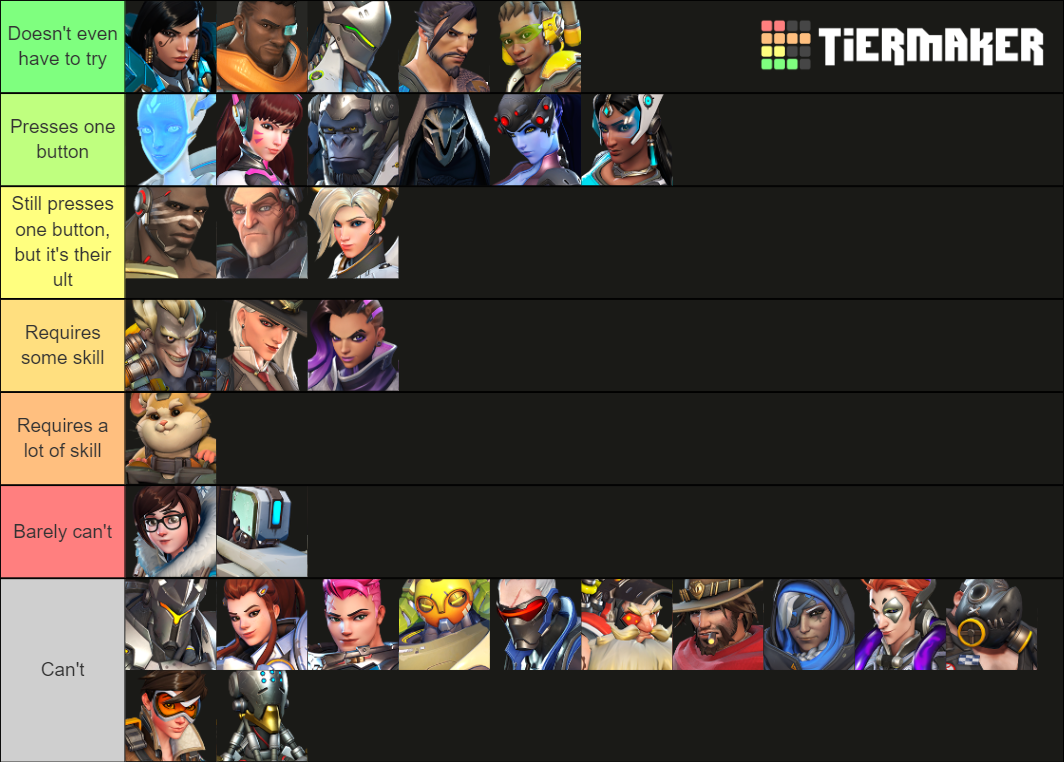 The first of these funny tier lists comes graciousness of the Overwatch player moobisk, and it sees every legend positioned by the amount it would damage to bite the dust to them, in actuality. Obviously, the marksmen like Widowmaker and Ana wind up in D tier, as death would be quick because of their rifles and precision. C Tier is loaded with characters like Tracer and Sombra, as they would require a couple of shots to kill. B Tier has Mei, which is reasonable given her freeze firearm. Junkrat and Pharah's explosives settle on them reasonable decisions for A Tier, while S tier astutely incorporates Winston and Brigitte.